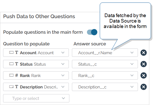 Push data to other questions in the form (optional). You do this the same way you would for a standard Data Source.