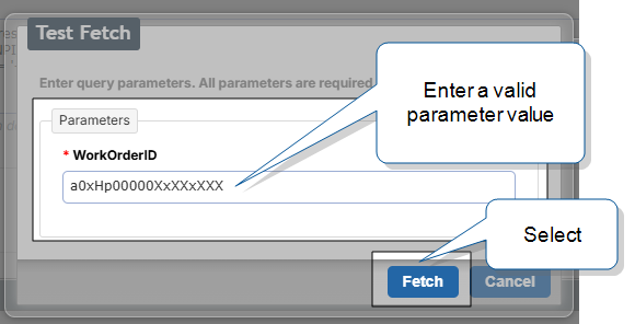 In the Test Fetch window, enter valid values for all your parameters. Then, select Fetch.