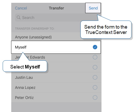 TrueContext Teamwork is an Enterprise tier feature that enables mobile users to transfer incomplete forms for other users to complete as part of a multi-user workflow. This can be useful for jobs that require someone else's expertise or that span multiple shifts.-enabled forms while keeping the record assigned to them. To do this, they transfer the form and select the option Myself. This sends a copy of the ongoing work to the server, making it available on any of the user’s other devices. Additionally, supervisors can view incomplete work from the TrueContext Web Portal